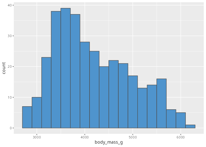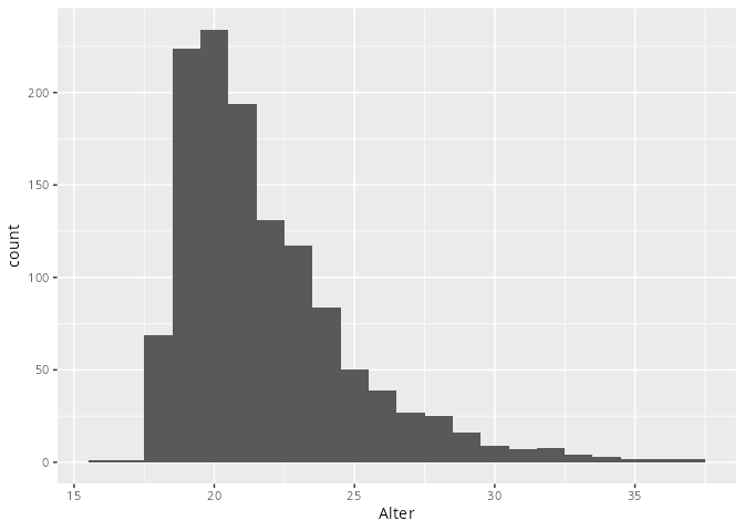 Die übliche Darstellung eines solchen Merkmals ist das Histogramm. Die geometrische Funktion hierzu ist geom_histogram()