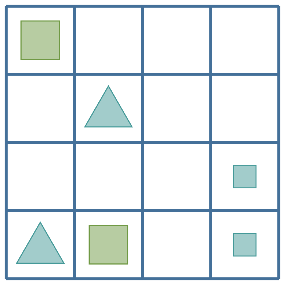 Die Grundmenge sind die Objekte in Abbildung 18.1, also Dreiecke und Quadrate in verschiedenen Größen und Farben.