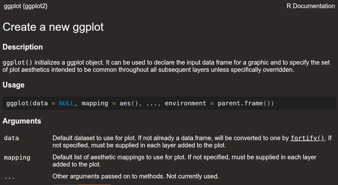 geom_point(mapping = aes(color = species))Sehen wir uns dafür einmal die Hilfe der Funktion ggplot() an:
