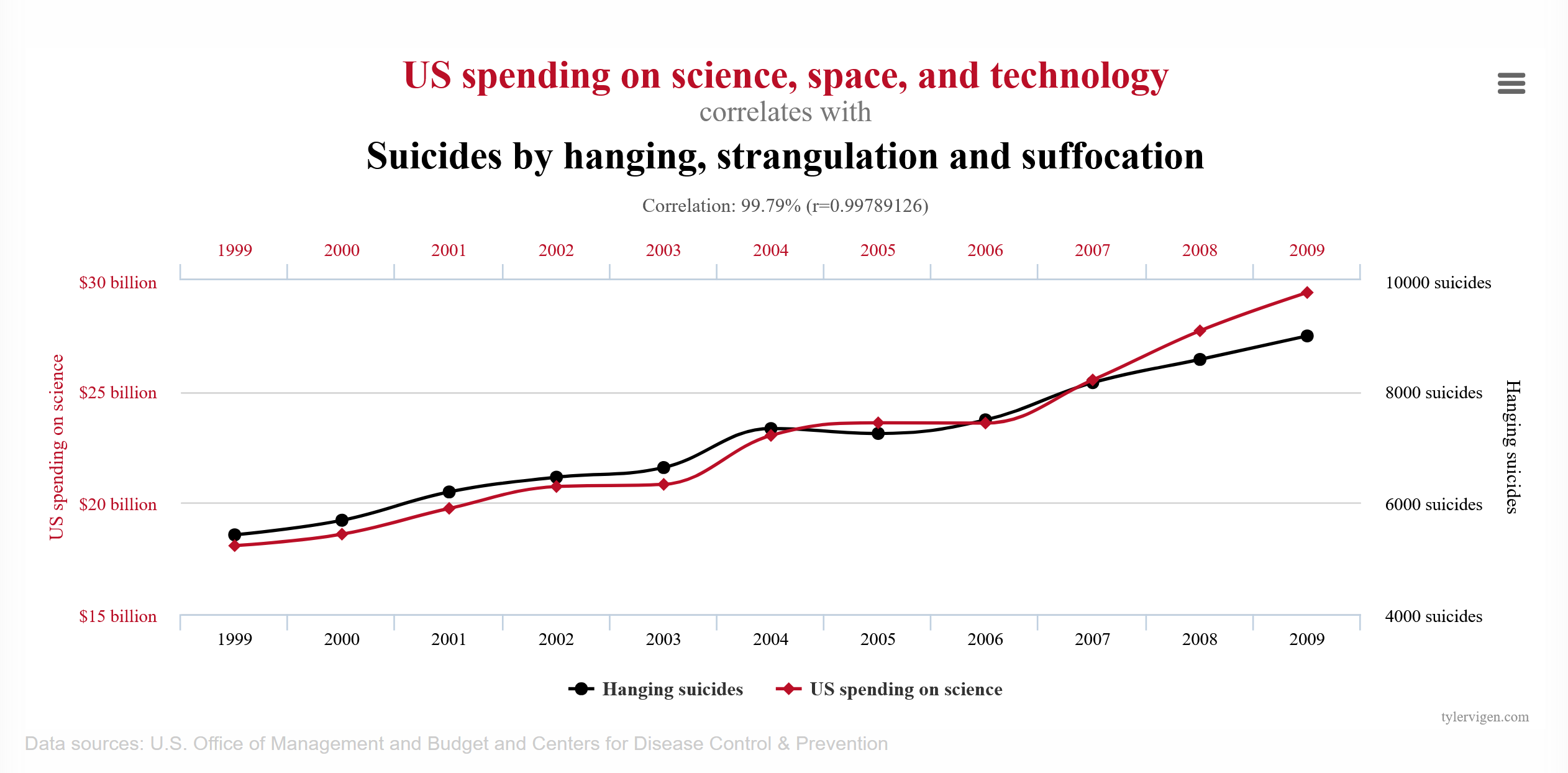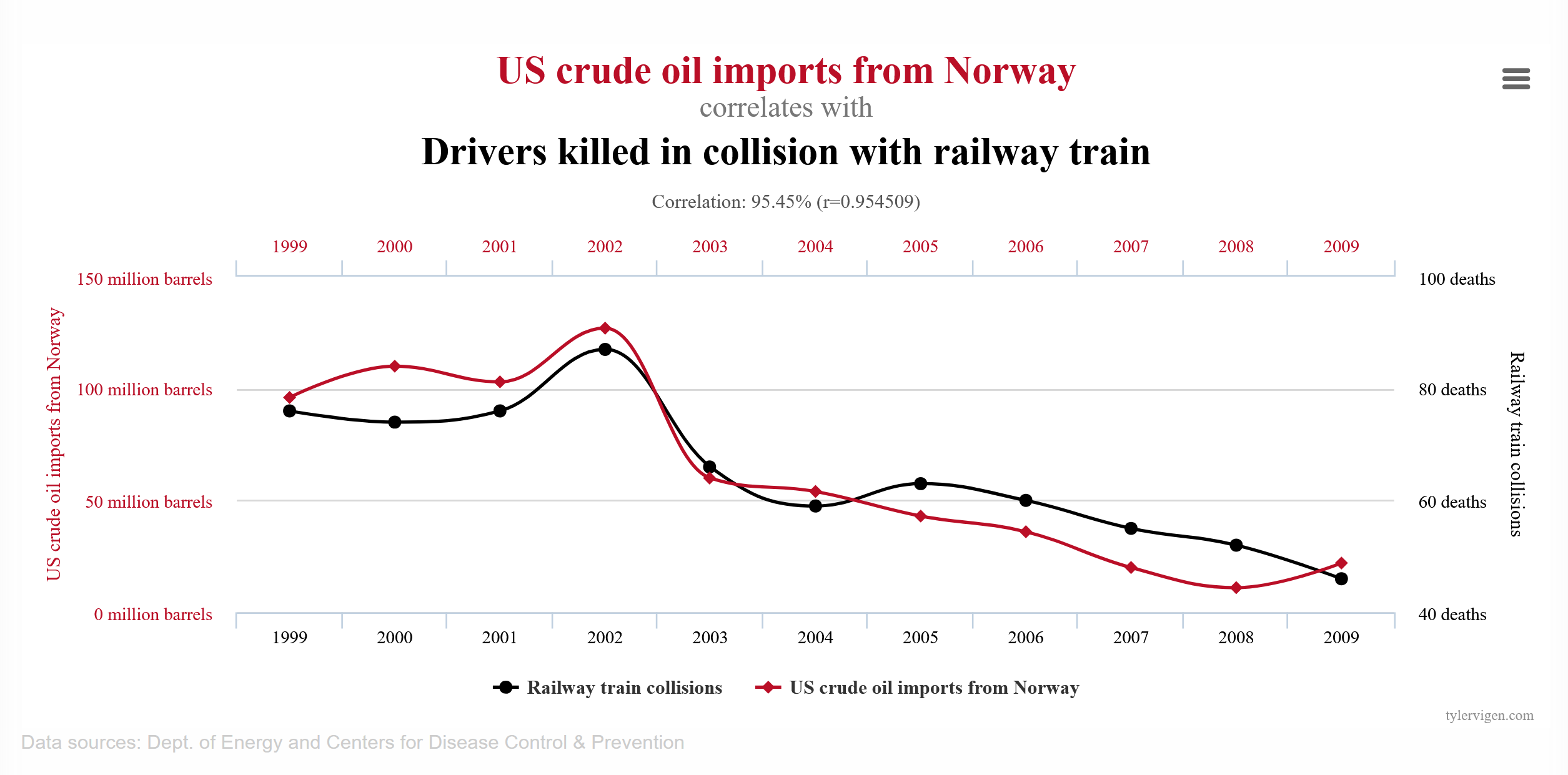 Hohe Korrelationen heißen nicht, dass es wirklich einen Zusammenhang zwischen den beiden Merkmalen geben muss, schon gar keinen kausalen. Auf der Seite Spurious Correlations findet man stark korrelierte Merkmale, die keineswegs irgendetwas miteinander zu tun haben, wie zum Beispiel diese beiden Grafiken zeigen.