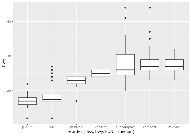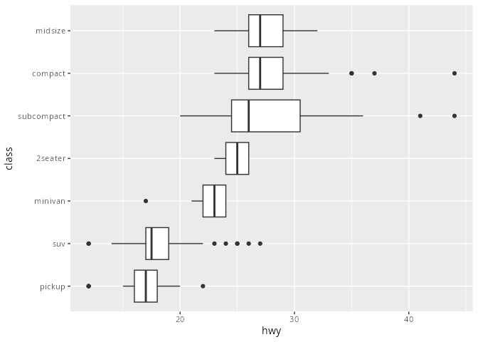 geom_boxplot(aes(x = reorder(x = class, # kateg. zu ordnendes Merkmal