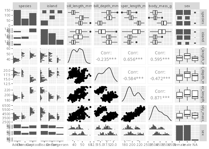 kann man eine Gesamtübersicht über eine Datentabelle erlangen. Durch die Funktion ggpairs()