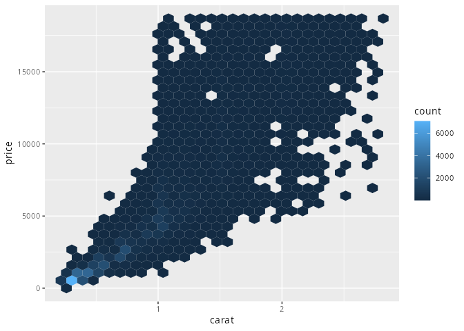 teilen die Ebene, deren Punkte die Werte der beiden metrischen Merkmale repräsentieren, in Rechtecke oder Hexagone auf. Nun wird - analog zum Histogramm - gezählt, wie viele Beobachtungen in den einzelnen Flächen liegen. Die Farbe repräsentiert diese Anzahl, die der Anzahl der Beobachtungen entspricht, die in einem Streudiagramm in der jeweiligen Fläche lägen.