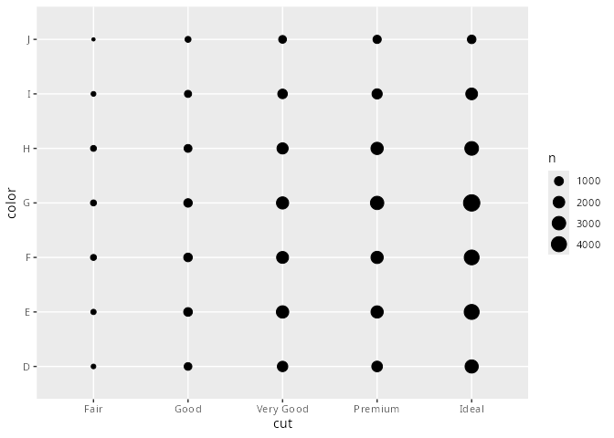 Im Fall zweier kategorialer Merkmale muss für eine Häufigkeitsanalyse gezählt werden, wie oft jedes Beobachtungspaar vorkommt. Dies erledigt die geometrische Funktion geom_count()