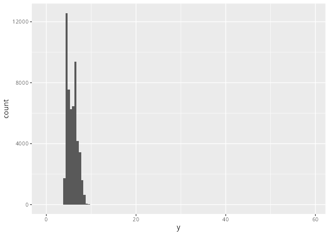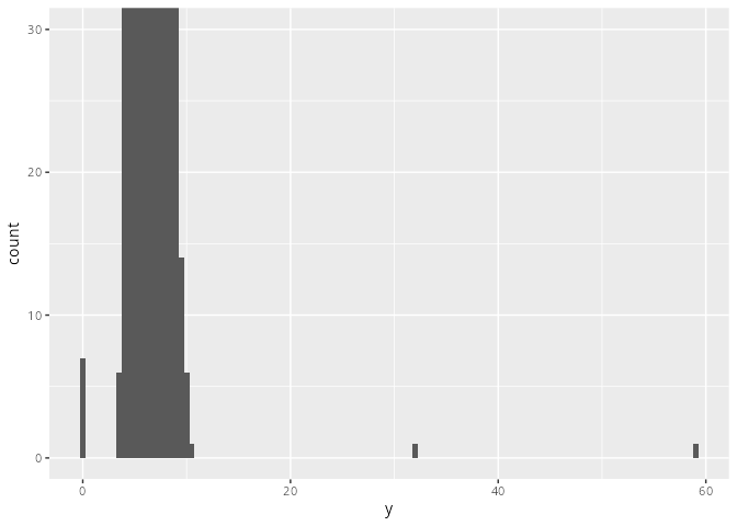 Die beiden großen y-Werte sind offenbar auch falsche Einträge, da der Preis nicht so utopisch hoch ist, wie er für solche Diamanten sein müsste.