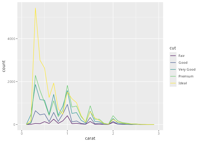 Während die obigen Histogramme alle Diamanten betrachtet, könnte es auch interessant sein, das Gewicht je Schnitt darzustellen. Eine Möglichkeit dies in nur einer Grafik zu machen wäre die Funktion geom_freqpoly()
