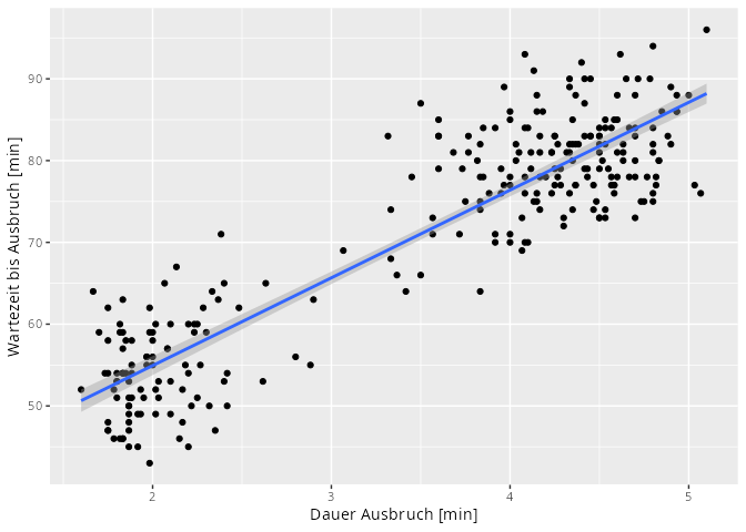 labs(x = "Dauer Ausbruch [min]", y = "Wartezeit bis Ausbruch [min]")