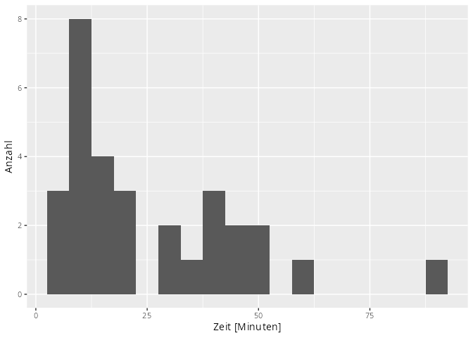 Es ergaben sich die folgenden Antworten. Dabei steht in der oberen Zeile die Antwort in Minuten und in der zweiten Zeile steht wie viele der Studenten diese Antwort gegeben haben.