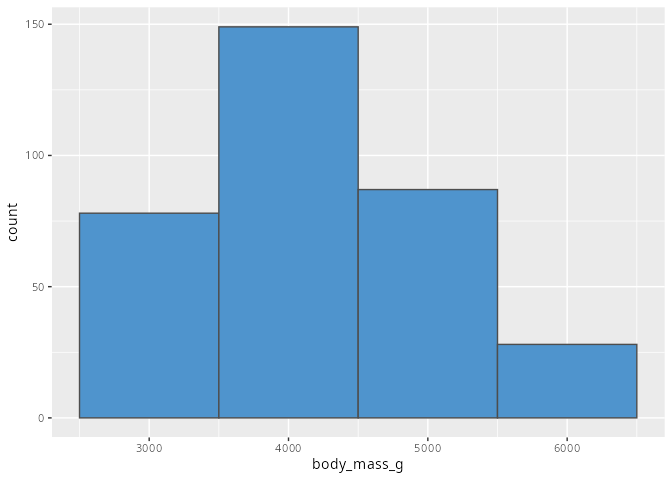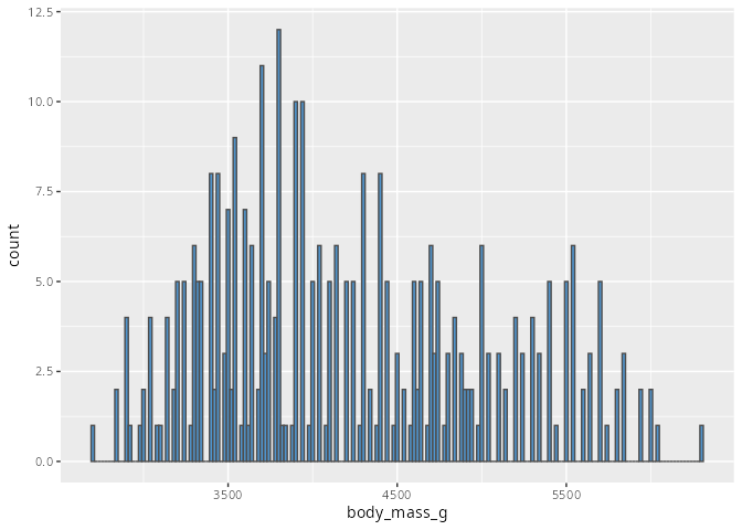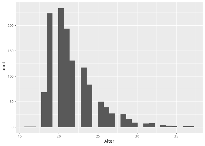 Die übliche Darstellung eines solchen Merkmals ist das Histogramm. Die geometrische Funktion hierzu ist geom_histogram()