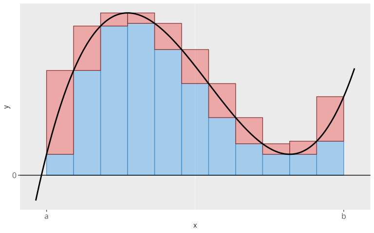 Die Fläche F unter der Kurve kann nun durch eine Obersumme S_n, also die Summe der größeren Rechtecke (in den Grafiken rot und blau), nach oben abgeschätzt werden und durch eine Untersumme s_n, (in den Grafiken nur die blauen Rechtecke) nach unten. Es gilt S_n > F > s_n. Der Übersicht halber verzichten wir in der Notation auf die Grenzen a und b. In Abbildung 19.1 ist die Untersumme s_{11} (blaue Rechtecke) und die Obersumme S_{11} (blaue und rote Rechtecke) eingezeichnet.