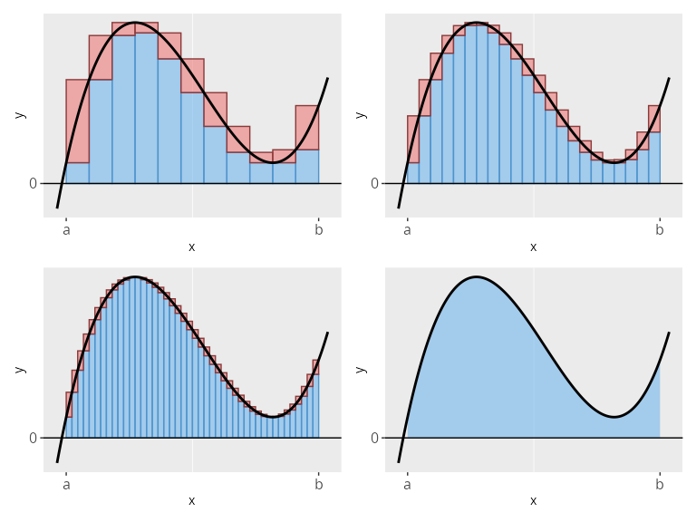 Die Idee ist die Fläche unter der Kurve durch zwei andere Flächen, der Obersumme S_n und der Untersumme s_n zu nähern. Dazu teilen wir das Intervall [a, b] in n gleich breite Segmente der Breite \Delta x = \frac{b-a}{n} ein. Dann werten wir die Funktion an den Stützstellen a, a + \Delta x, a + 2\Delta x, \cdots, a + n\Delta x = b aus und können so die Flächen der Rechtecke, wie sie in Abbildung 19.1 zu sehen sind, bestimmen.