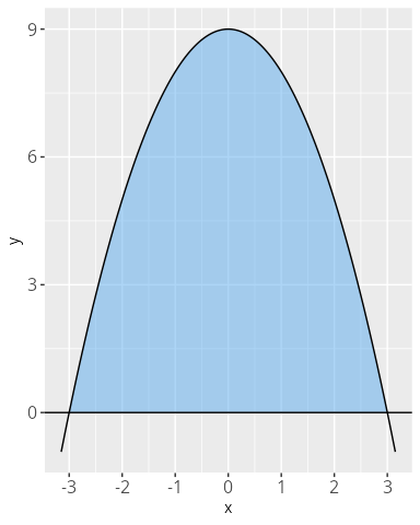 \begin{aligned} \int_{-3}^{3} 9-x^2\,\mathrm{d}x & = \left[9x-\frac{1}{3} x^3 \right]_{-3}^{3} \\ & = 2 \cdot \left[9x-\frac{1}{3} x^3 \right]_{0}^{3} \\ & = 2\cdot ((27 - 9) - (0 - 0)) \\ & = 36 \end{aligned}