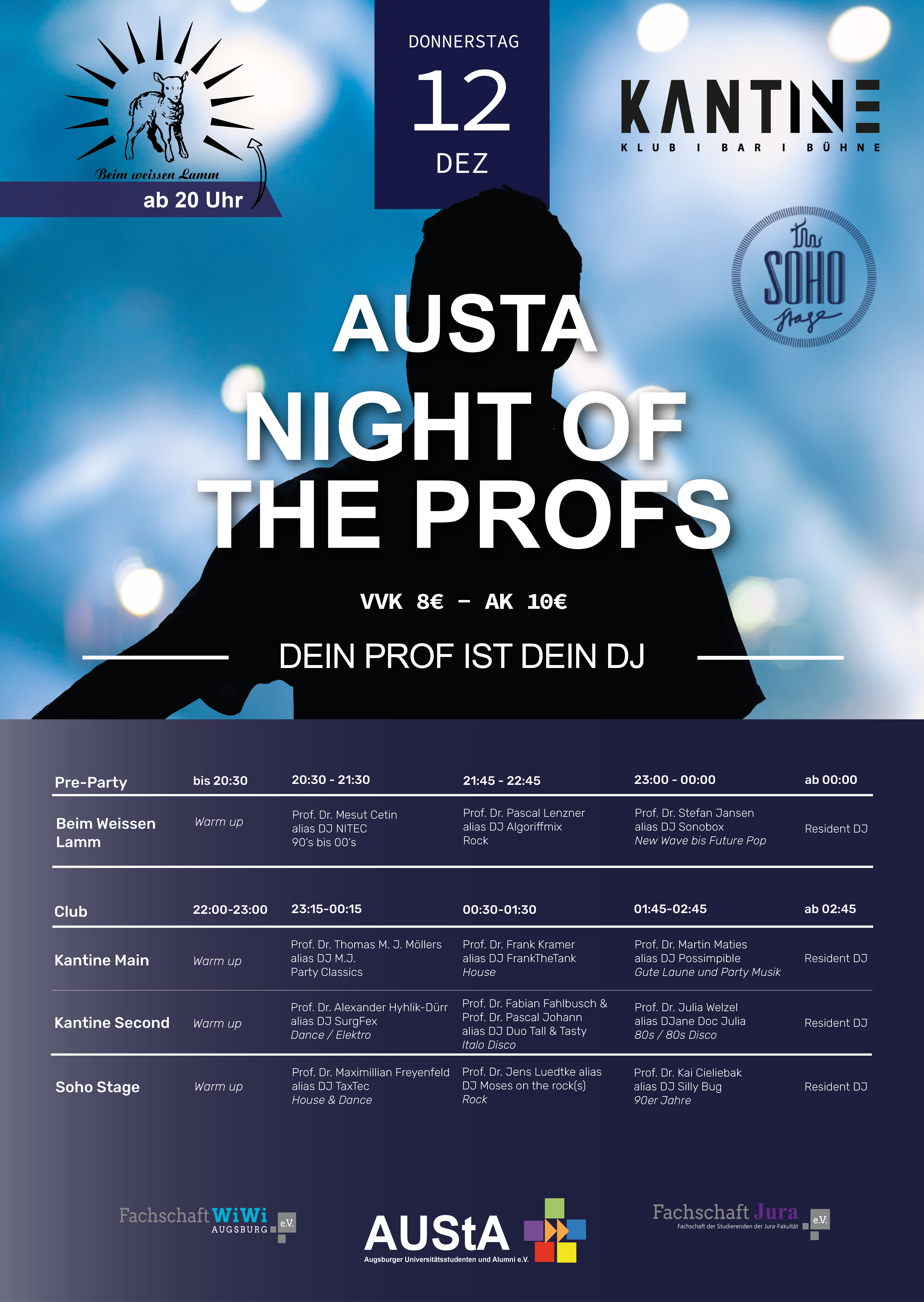 Am Donnerstag, den 12.12.2024 findet wieder die Night Of The Profs in Augsburg statt. In den Clubs Das Weiße Lamm, Soho Bar und der Kantine legen Profs der Uniuversität Augsburg und der TH Augsburg auf.